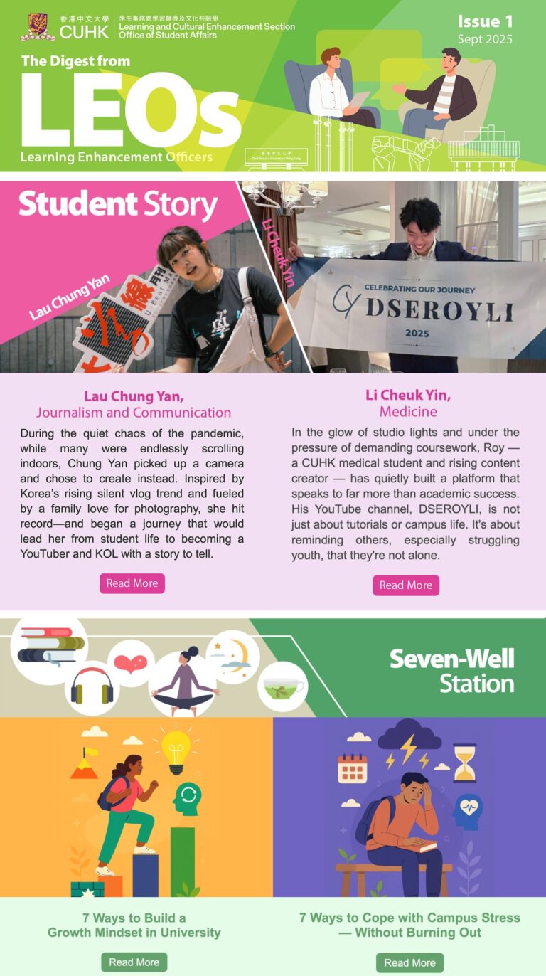 學習輔導主任(LEOs)將在整個學年期間定期發佈Digest,旨在為大家提供及時、全面的學習資源與資訊。我們深知,有效的溝通是幫助學生充分利用在中大時光的關鍵。因此,我們將根據發佈日期,精心整理並分享各類資源,確保每位同學都能及時獲取到最重要的資訊。